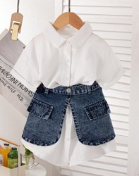 Europese en Amerikaanse nieuwe modieuze zomer korte mouwen shirt + denim taille rok decoratie meisjes 2-delige set