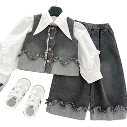Bộ vest denim mùa thu mới cho bé gái áo sơ mi trắng, áo vest và quần jean ống rộng cho bé gái Bộ 3 món