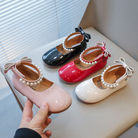 Korean Style Fashion Spring Autumn Kids Outwear Pu Pearl Bow Flat Dress Shoes for Girls